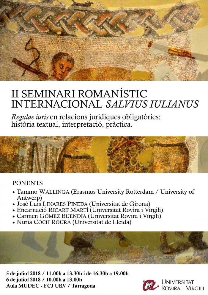 L'equip investigador del projecte "Regulae iuris sobre relaciones jurídicas obligatorias: historia textual, interpretación, práctica", liderat per la Univeristat Rovira i Virgili, ha organitzat el II Seminari Romanístic Internacional Salvio Juliano els dies 5 i 6 de juliol de 2018 a la Facultat de Ciències Jurídiques de la URV.
